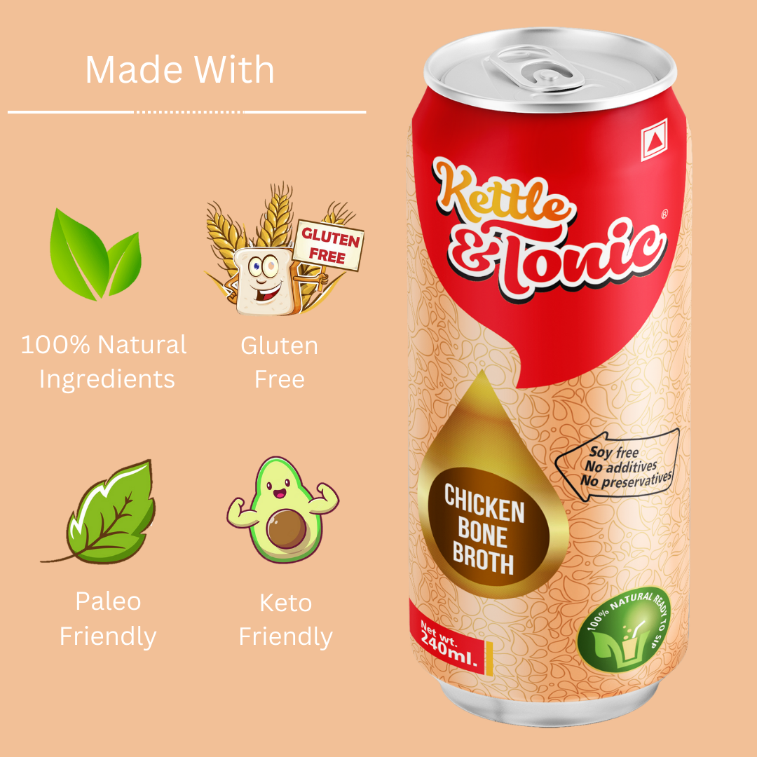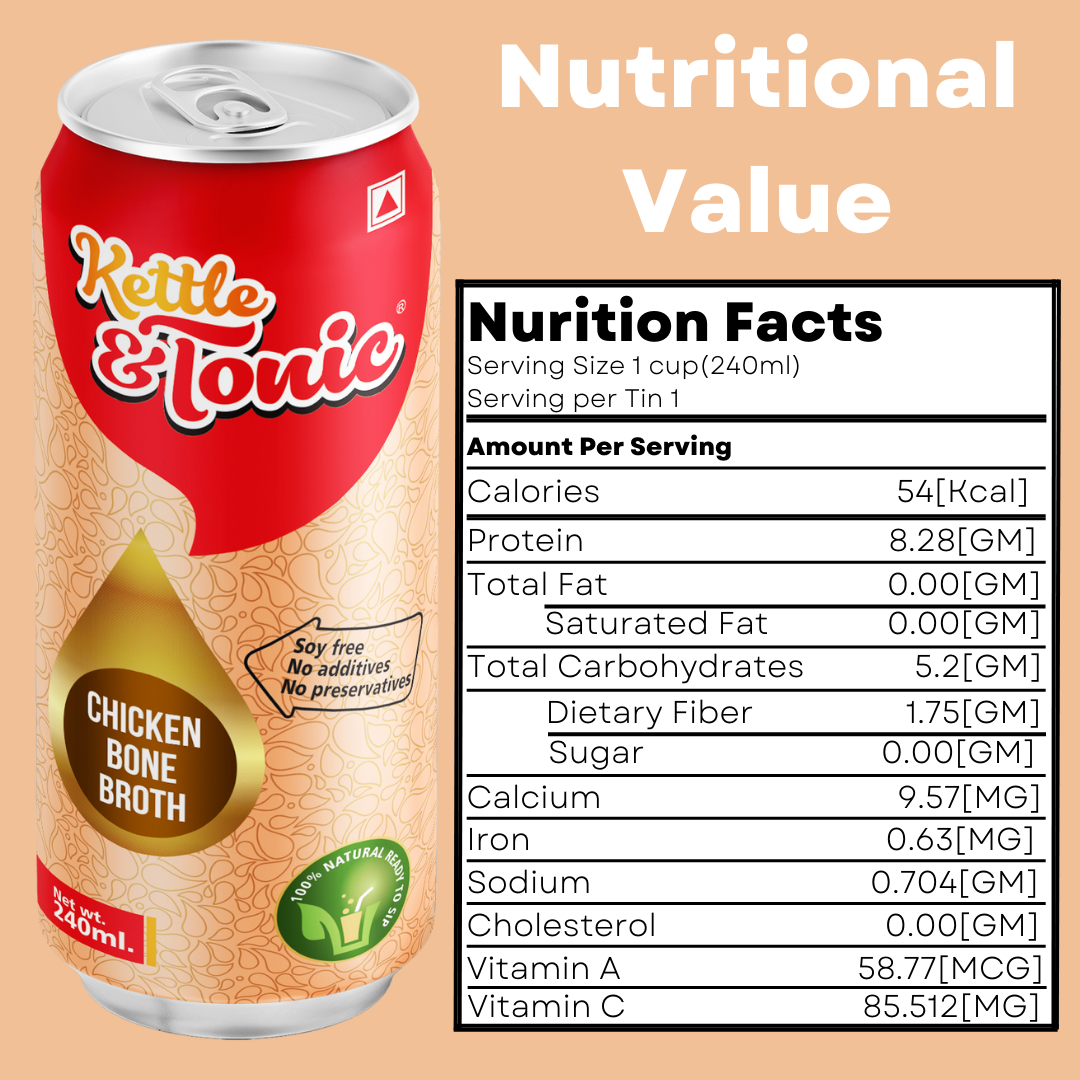 We prepare chicken bone broth with complete care, using ingredients, purified water, chickens bones, Vegetables , exotic herbs & spices are processed with traditional brewing methods and with modern technology allowing the nutrients in the bones – {collagen, glucosamine, chondroitin and other amino acids & minerals} to concentrates and release into the water. And that’s how we create nutrient-dense Golden Tonic.